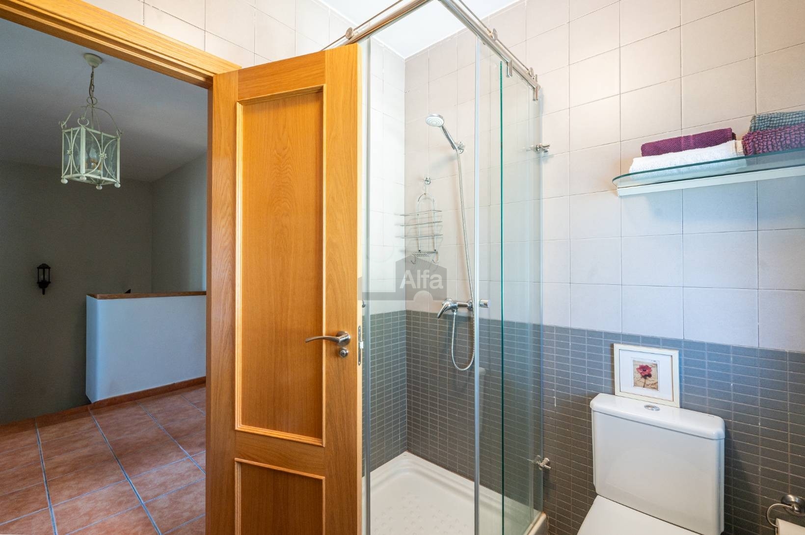 SEGUNDO BAÑO COMPLETO en la planta superior, que da servicio a los dormitorios de esta zona de la vivienda. Se trata de un baño funcional y bien conservado, que cuenta con luz natural, dispone de ducha con mampara, lavabo y bidé,