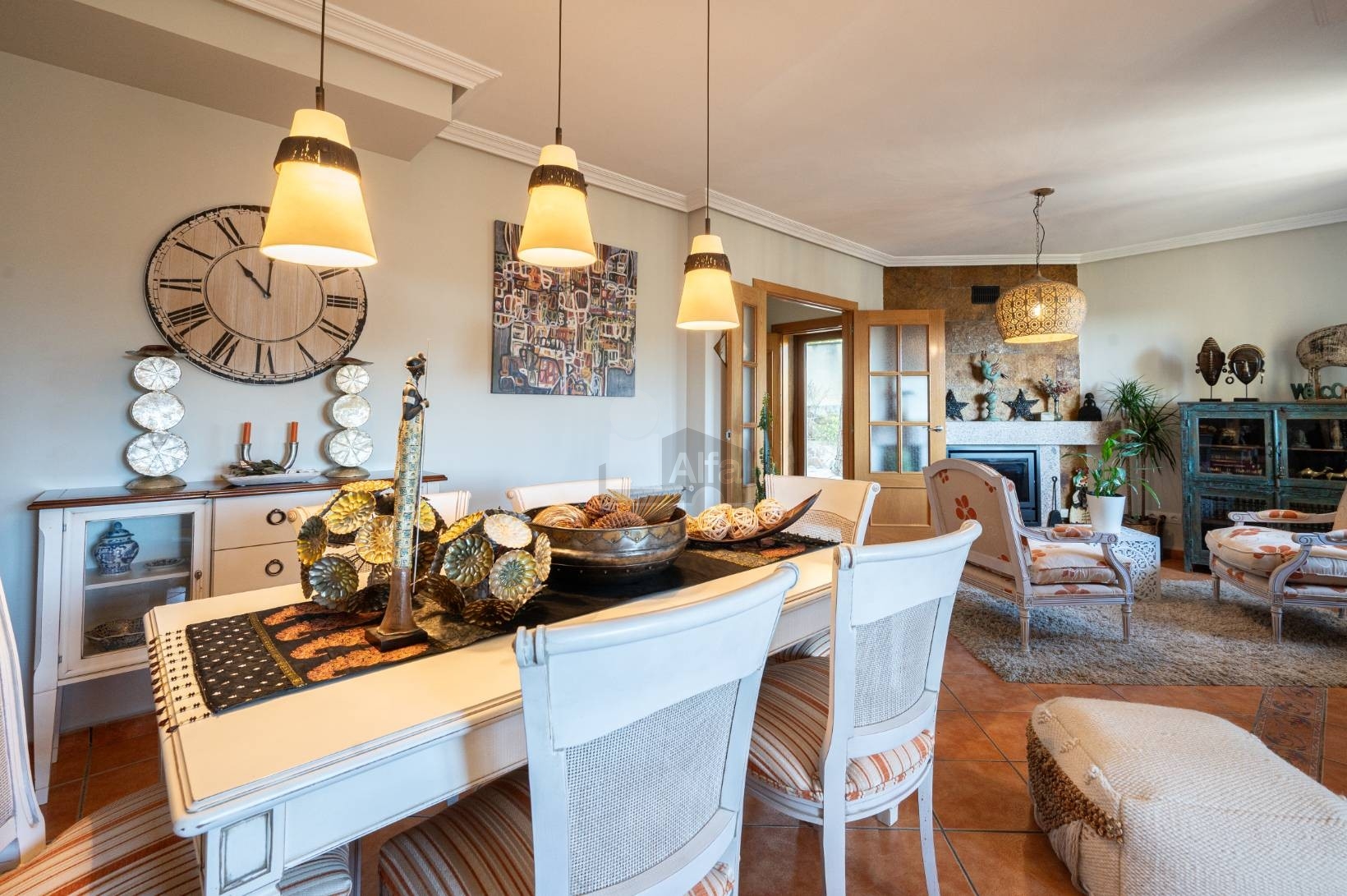La luz natural entra generosa a través de los ventanales, tamizada por cortinas ligeras que aportan calidez al ambiente. La zona más íntima se sirve de una chimenea, creando un rincón perfecto para las tardes de invierno
