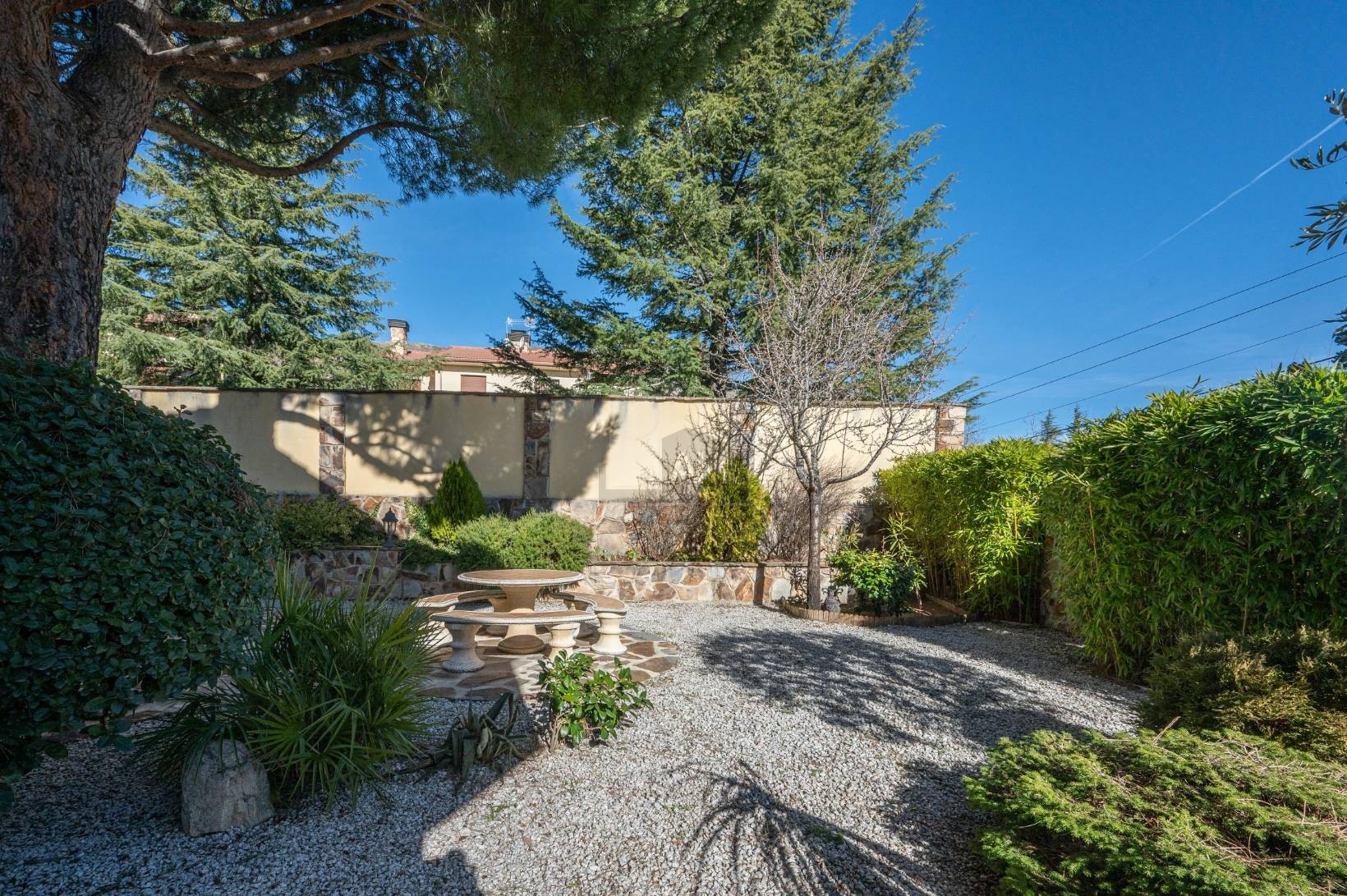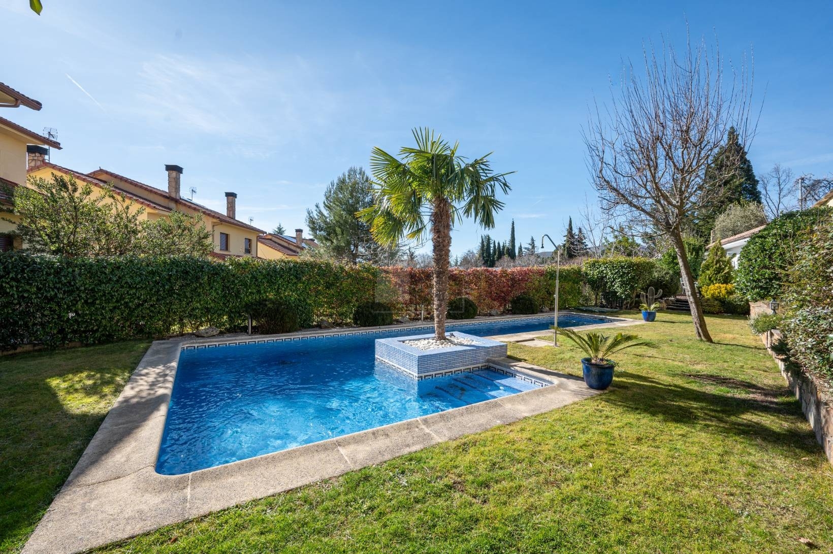 En la parte posterior se abre una zona ajardinada amplia y muy cuidada, presidida por una piscina perfectamente integrada en el entorno, rodeada de césped natural .